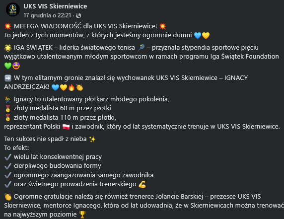 - Jestem wdzięczny za zaufanie i wsparcie, ponieważ dzięki temu mogę w pełni skupić się na dalszym rozwoju i realizacji kolejnych celów - dodaje lekkoatleta.