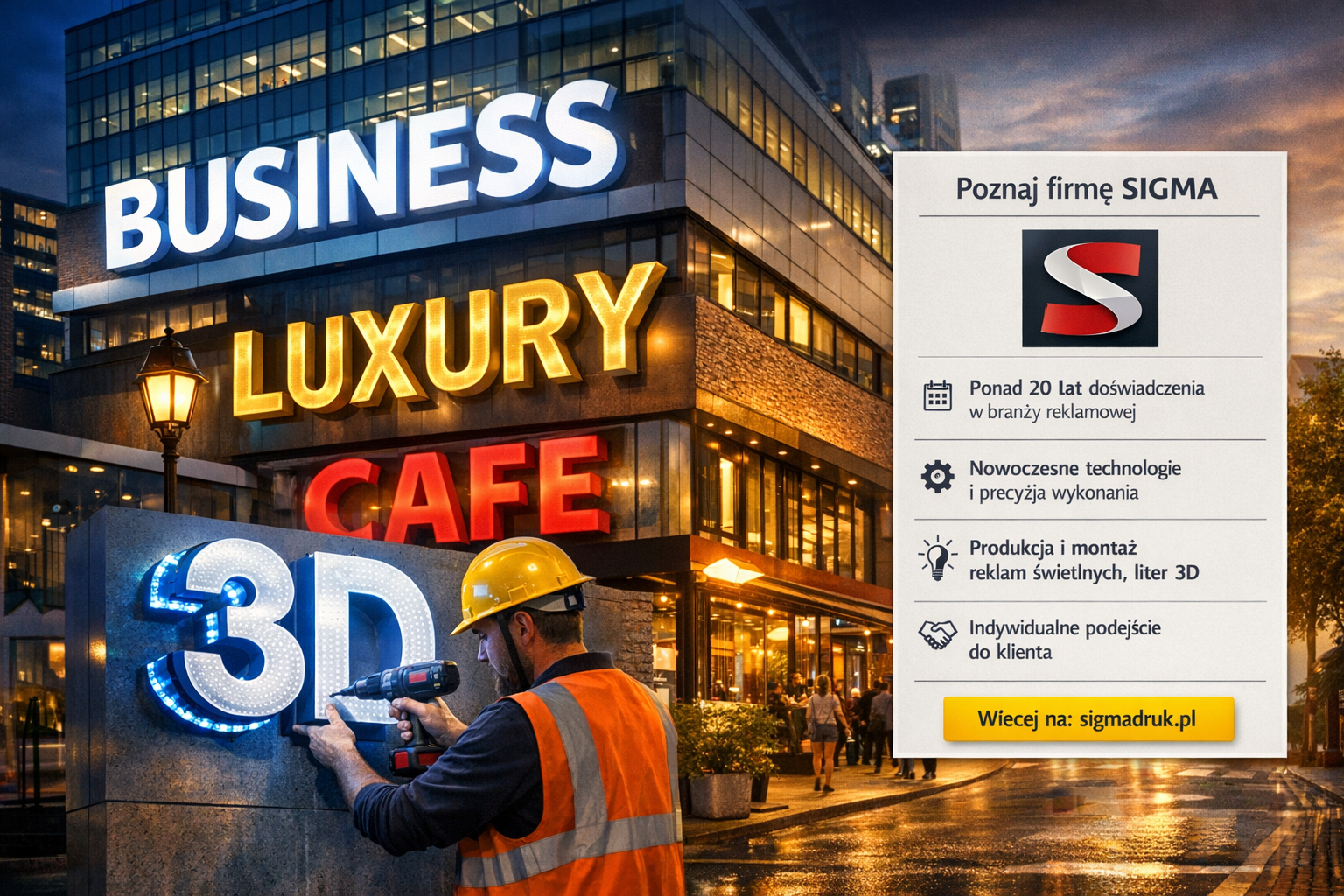 Przestrzeń miejska jest nasycona komunikatami reklamowymi. Aby wyróżnić się wśród innych, firmy sięgają po rozwiązania o wysokiej jakości wykonania, trwałych materiałach i zaawansowanych systemach oświetlenia LED. Światło tworzy pierwszy kontakt odbiorcy z marką, przyciąga wzrok i podkreśla charakter miejsca. Wpływa także na postrzeganie profesjonalizmu firmy.
