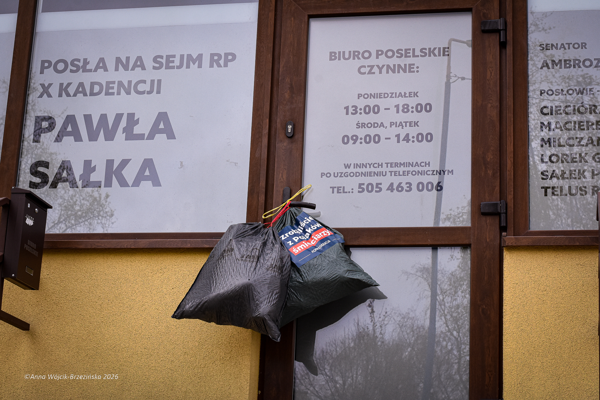 Warto też oddzielić dwie odpowiedzialności, które na wiecu i happeningu łatwo zlepić w jedną. Za ustawę założycielską odpowiada większość z lipca 2023 roku -- i tu Suszkowski ma rację, wskazując na PiS, ale za późniejsze dopracowywanie, przesuwanie terminów i techniczne poprawki odpowiada już kolejny obóz rządzący. Kto chce mówić uczciwie, musi powiedzieć jedno i drugie. Kto mówi tylko połowę, nie opisuje rzeczywistości, lecz buduje kampanijny przekaz. Dlaczego worów ze śmieciami działacze Nadziei nie złożyli także pod biurem parlamentarzystów Koalicji Obywatelskiej przy ul. Batorego? Złośliwie można stwierdzić – nie po drodze. Suszkowski mówi – bo ustawa zasadnicza jest dziełem PiS. I dodaje – a akcja w Skierniewicach jest częścią ogólnopolskiej akcji Konfederacji.