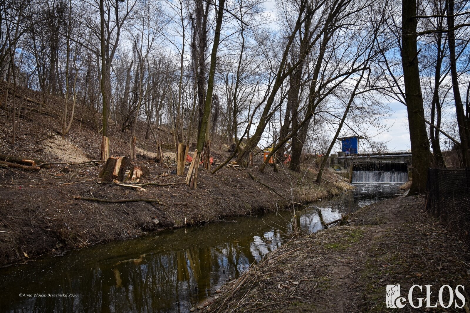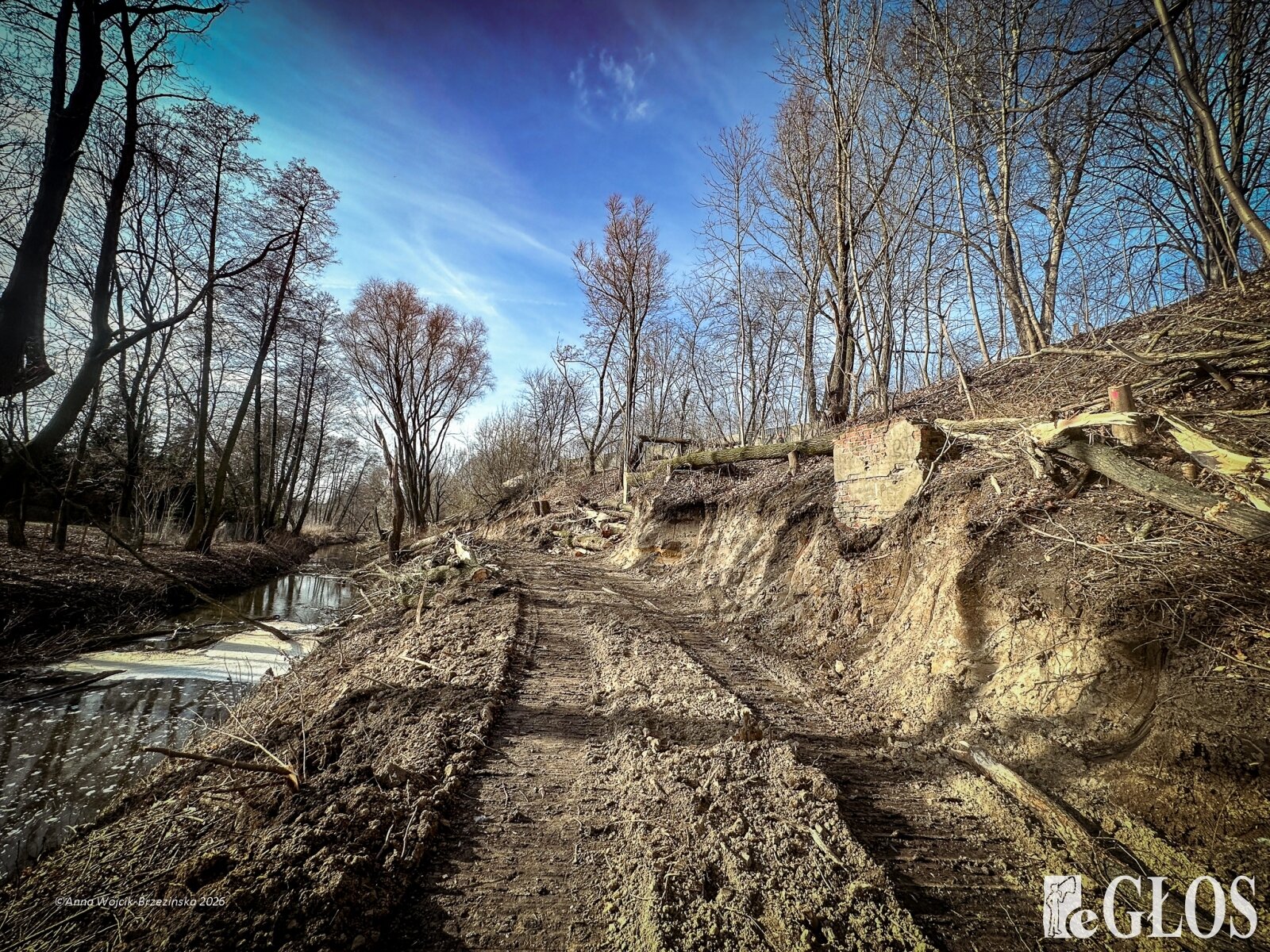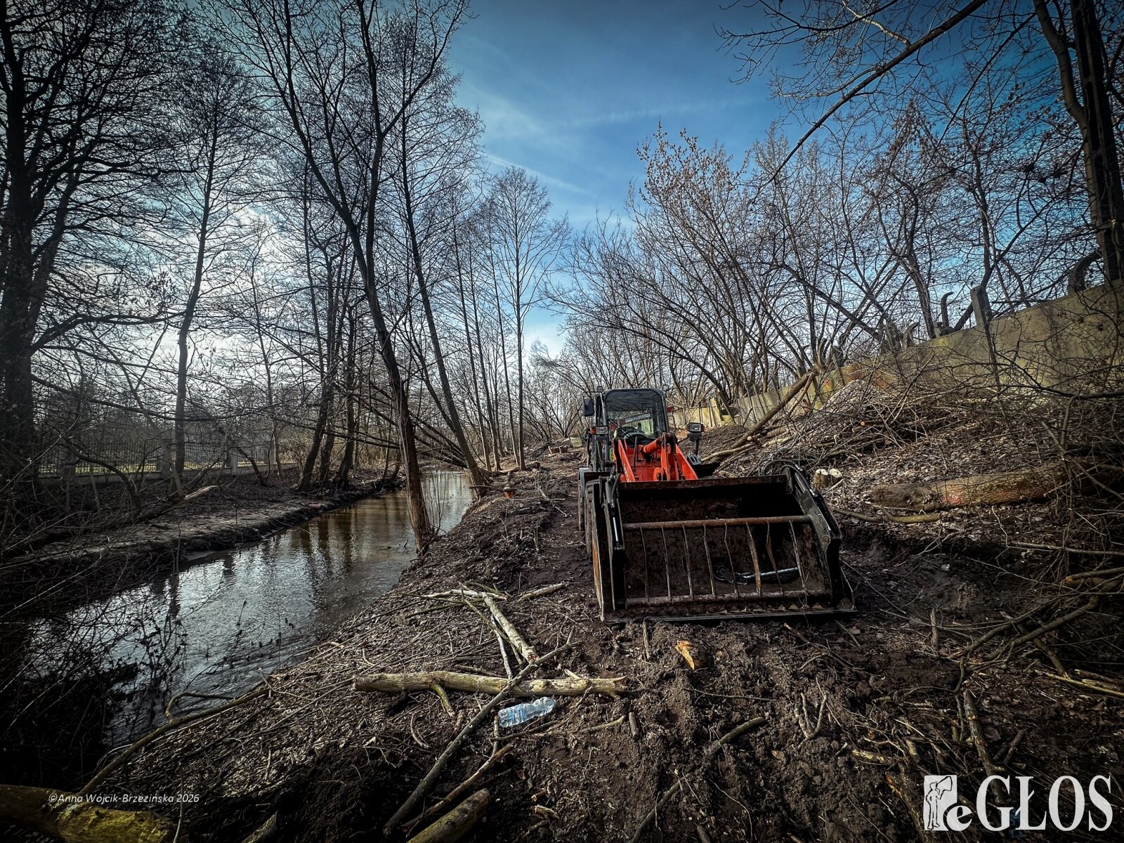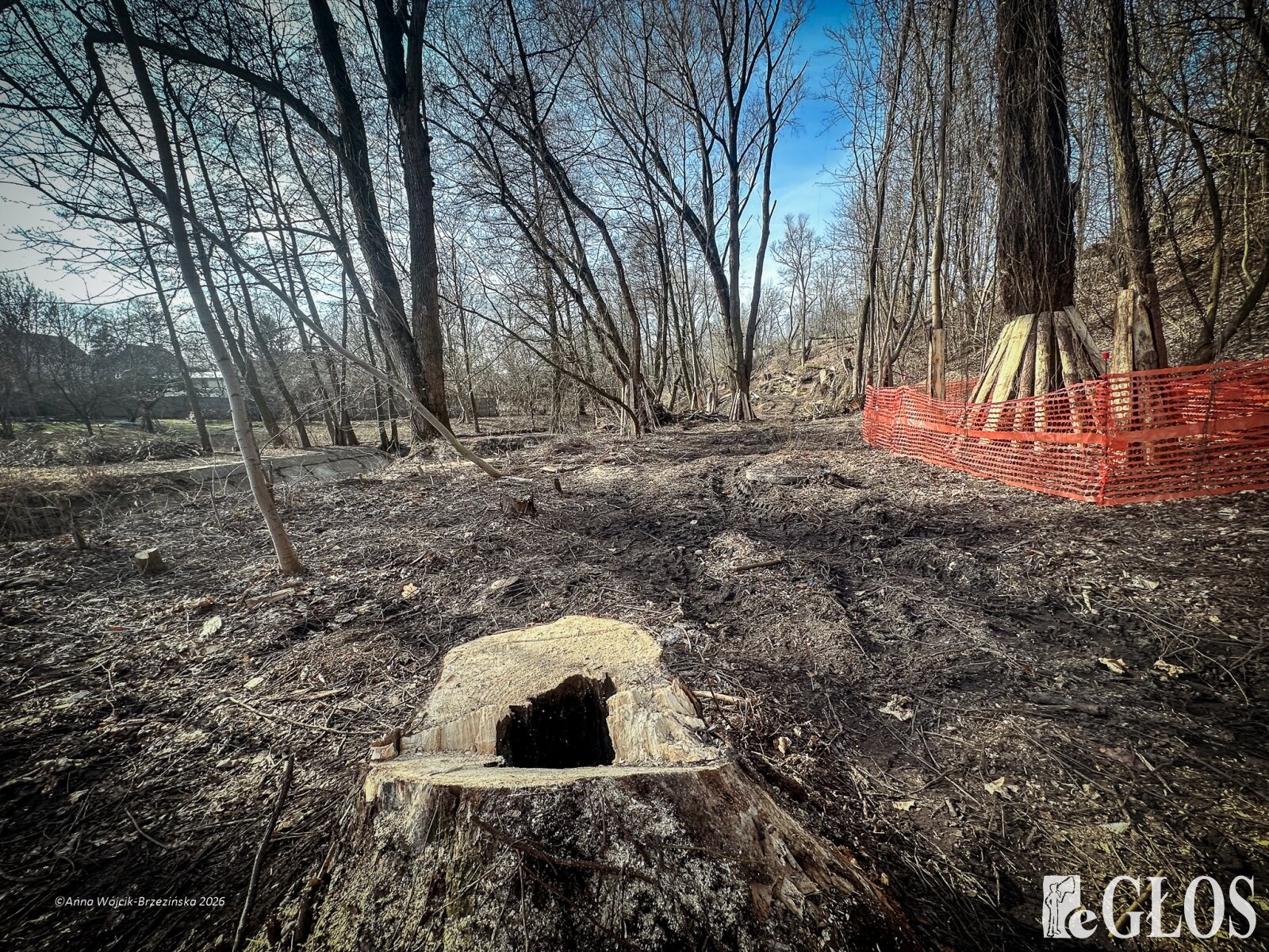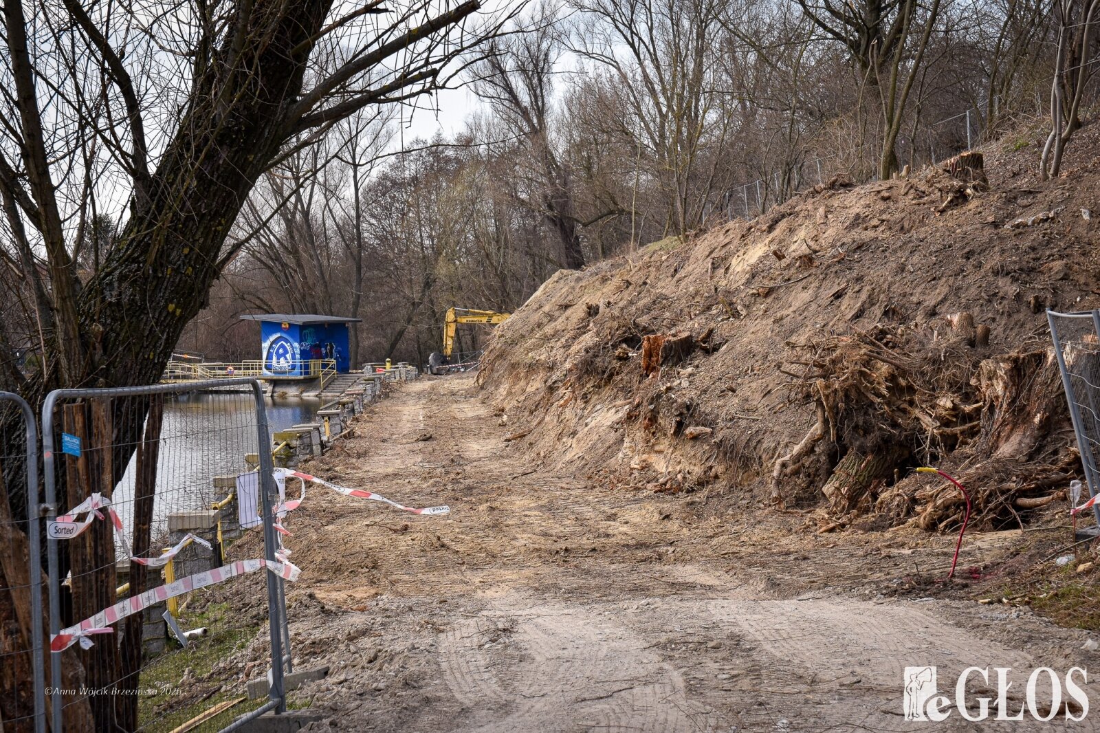 Plac budowy pokazuje prawdziwą skalę tej inwestycji. W fotorelacji widać wycięte drzewa, odsłonięty brzeg Skierniewki i teren, który musi zostać przygotowany pod mury oporowe oraz wzmocnienia skarp.