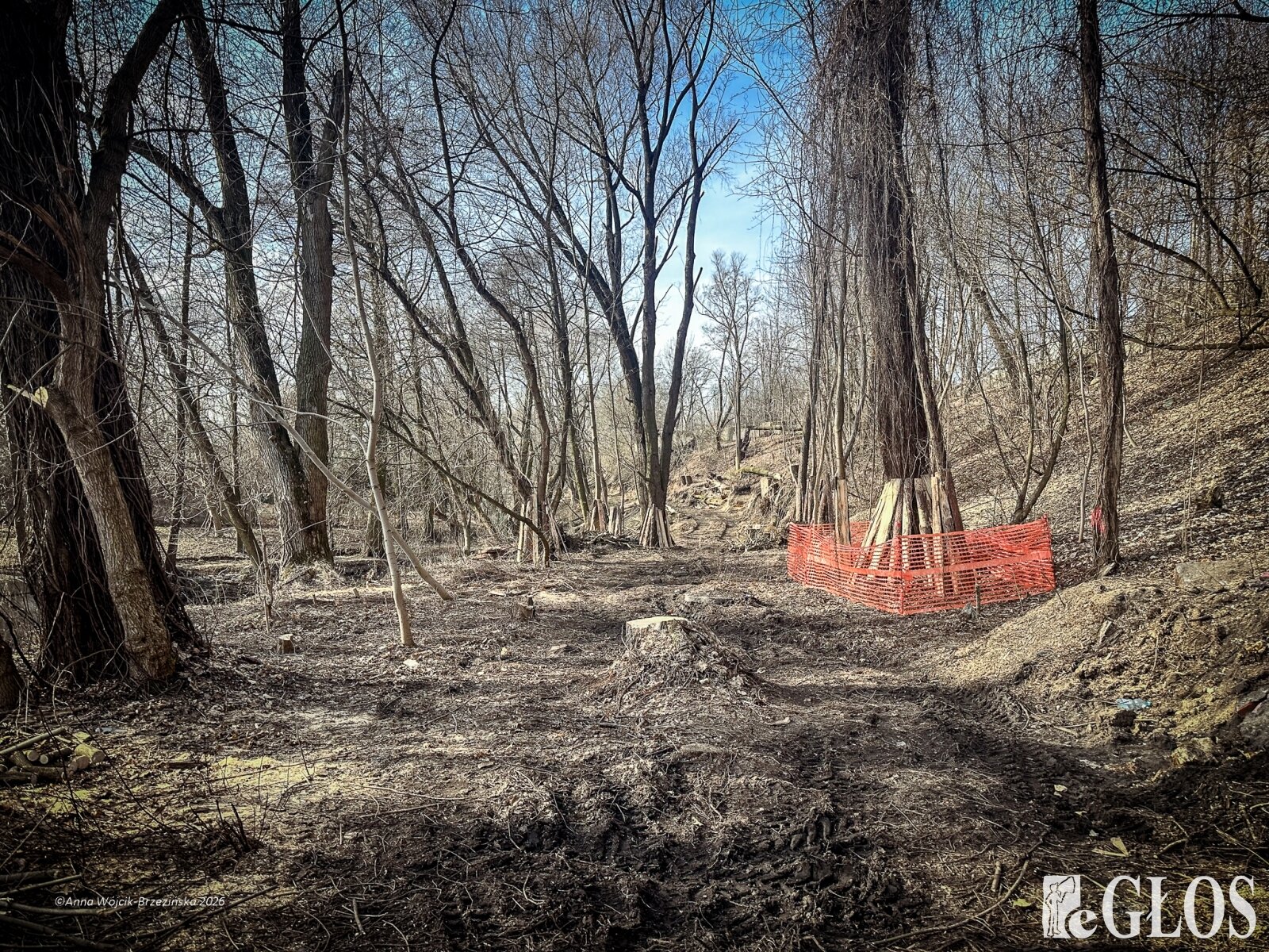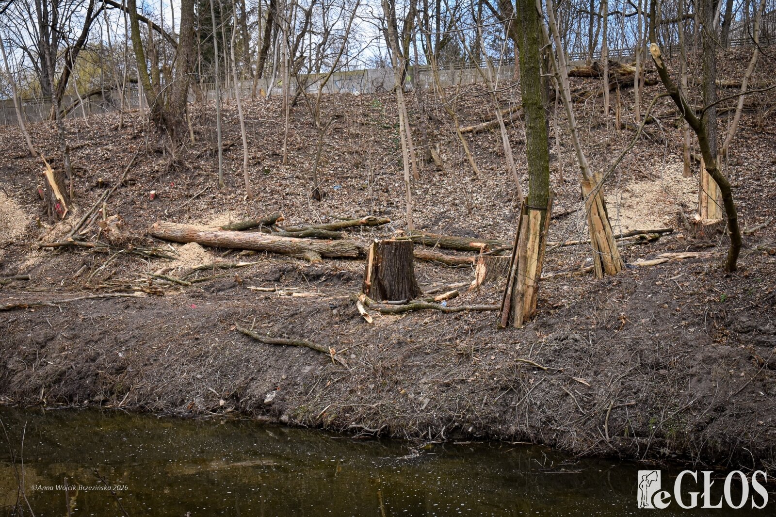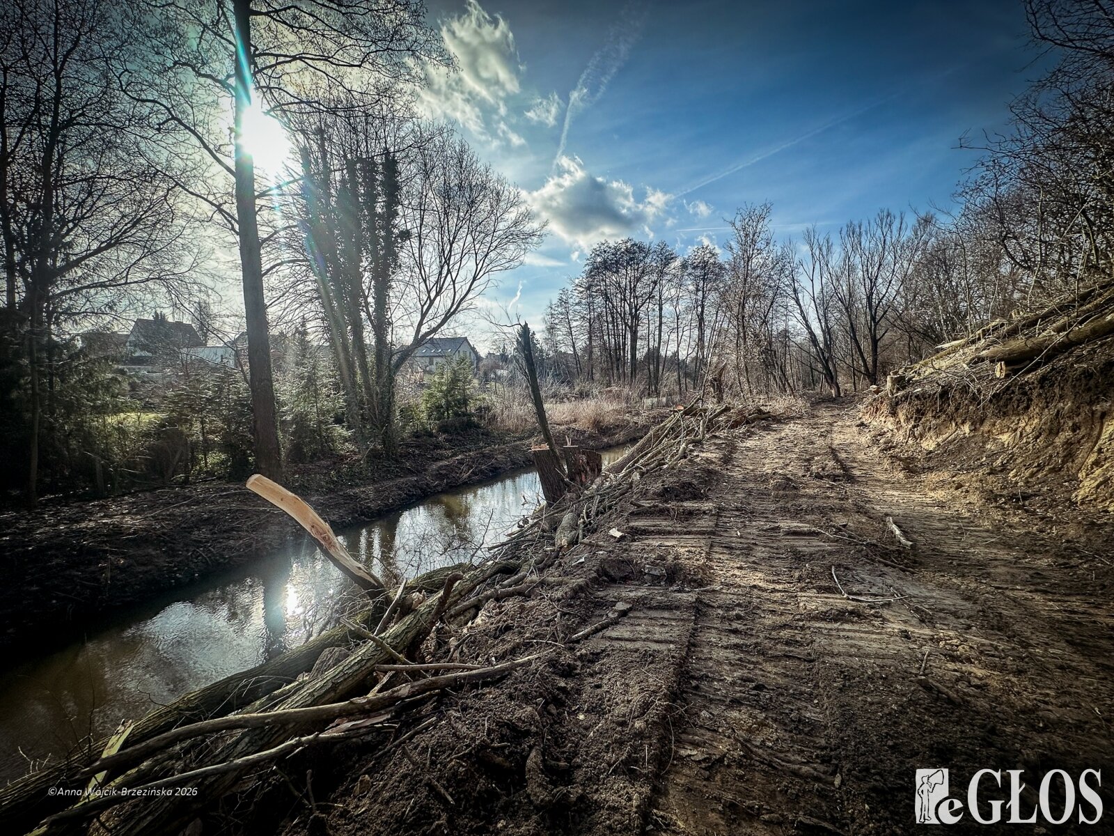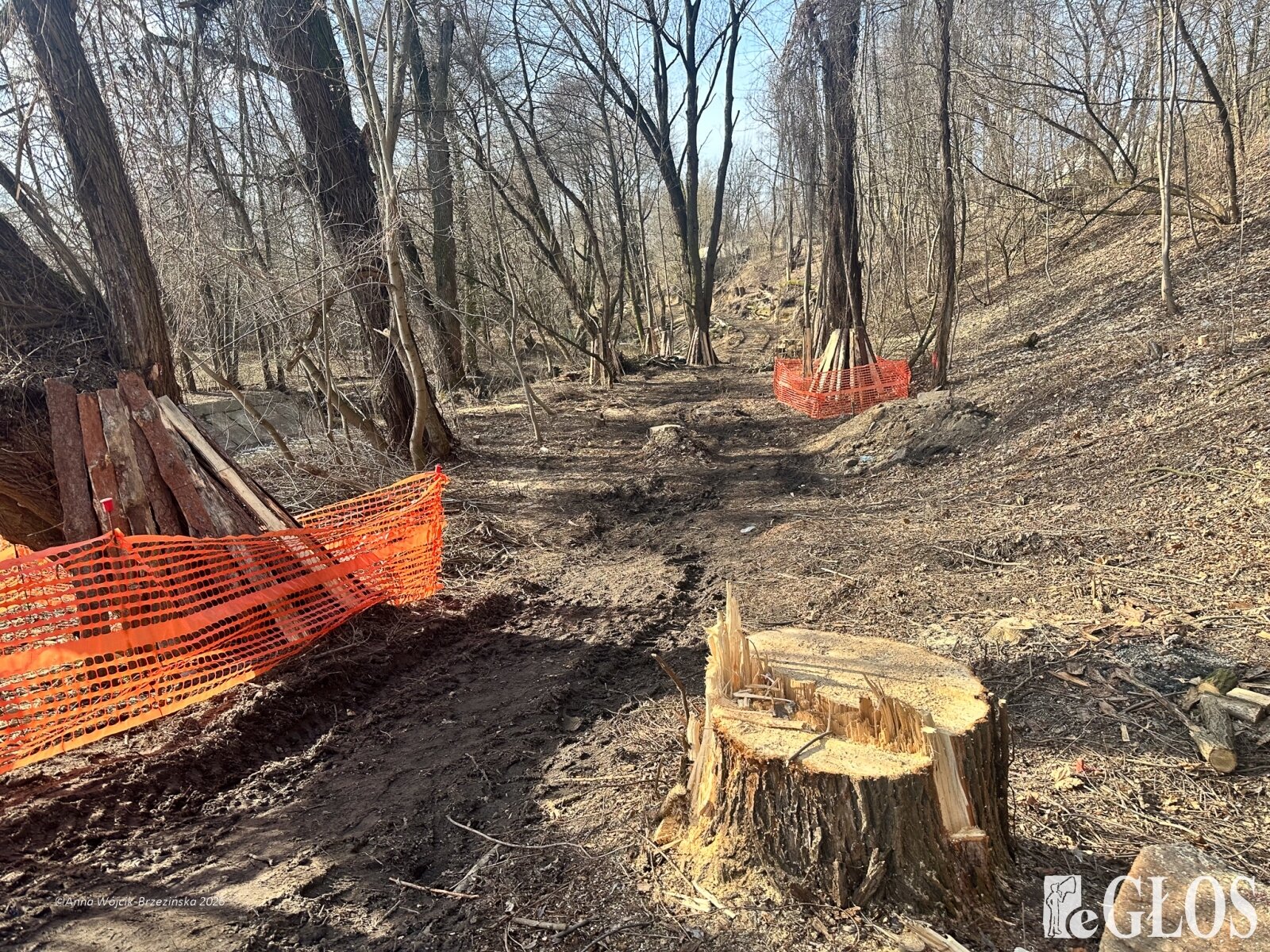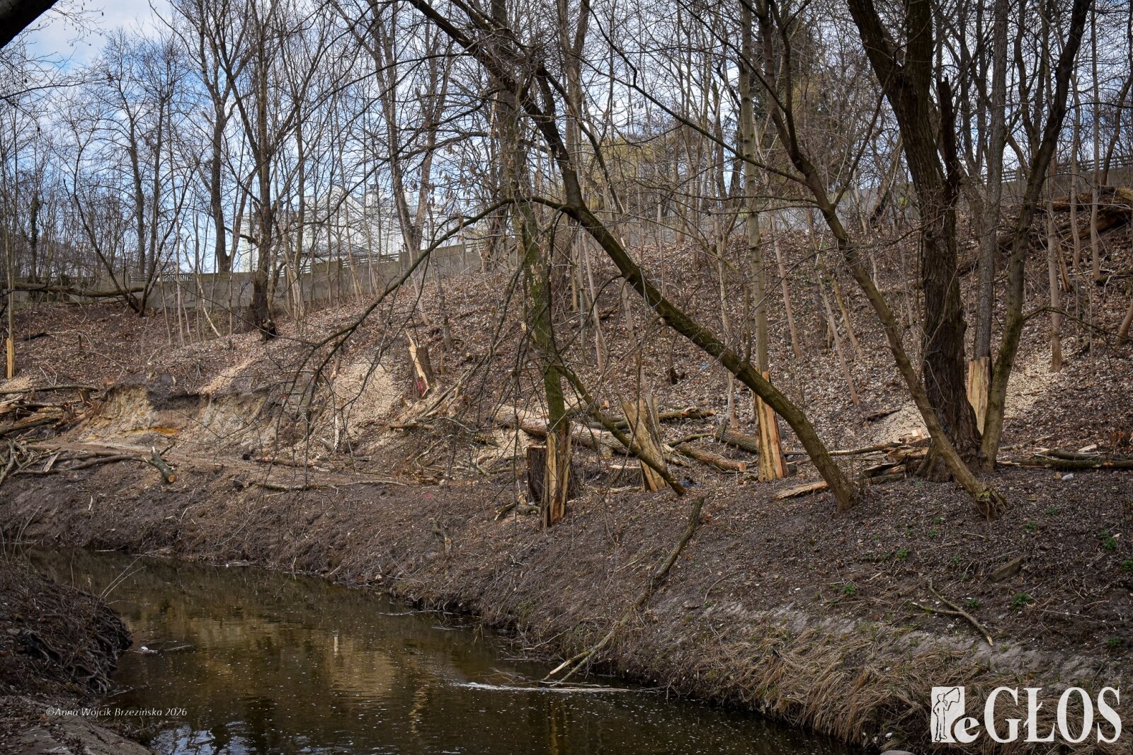 Plac budowy pokazuje prawdziwą skalę tej inwestycji. W fotorelacji widać wycięte drzewa, odsłonięty brzeg Skierniewki i teren, który musi zostać przygotowany pod mury oporowe oraz wzmocnienia skarp.