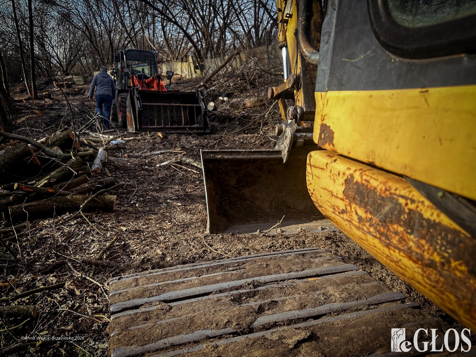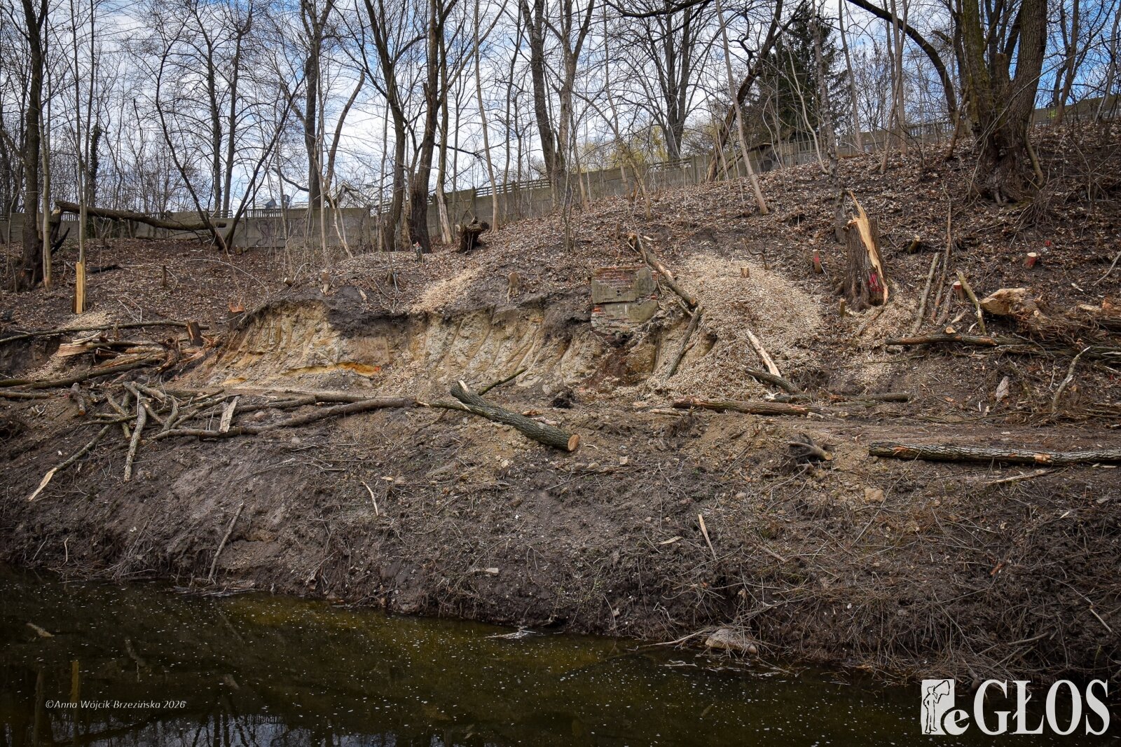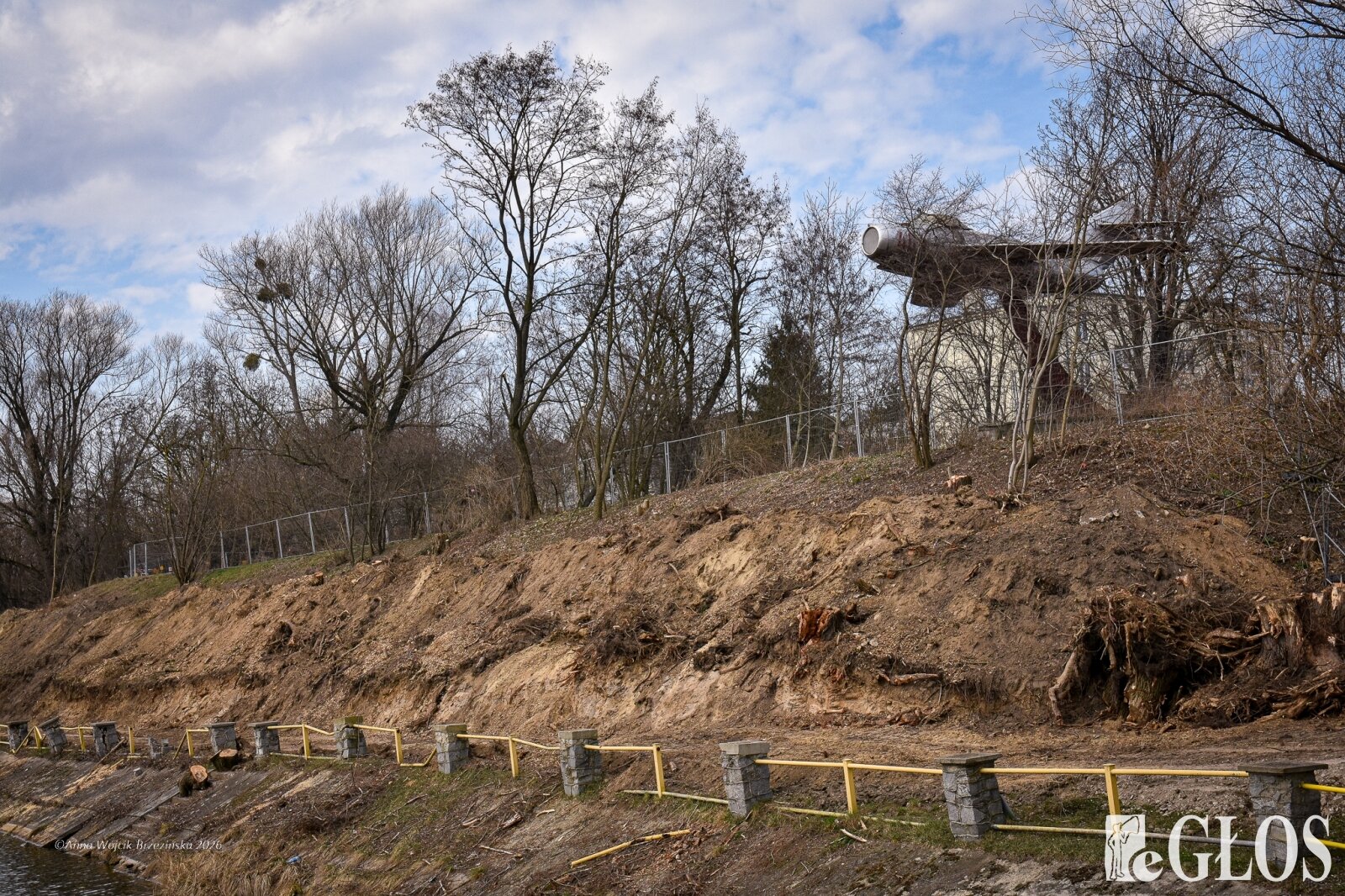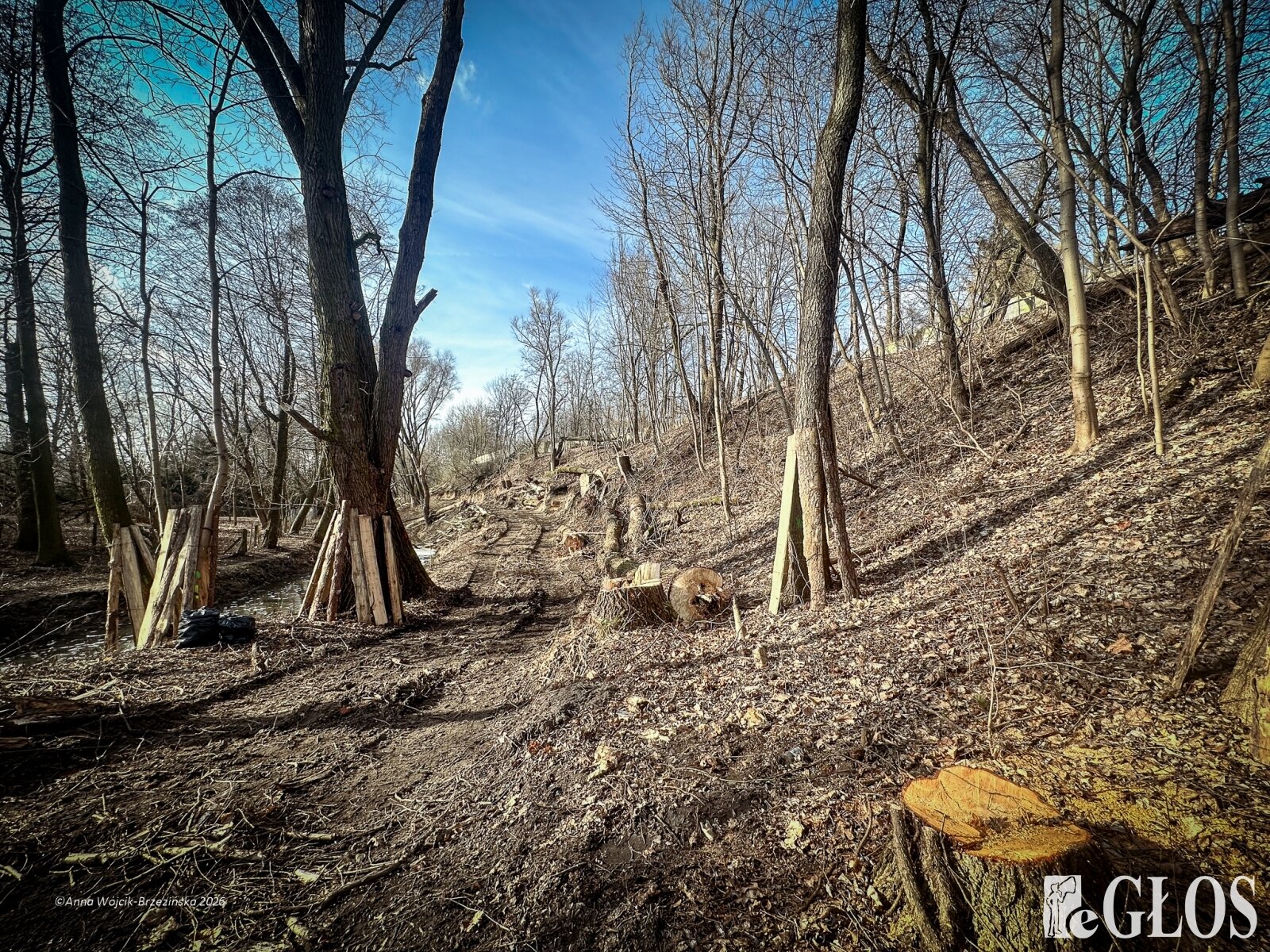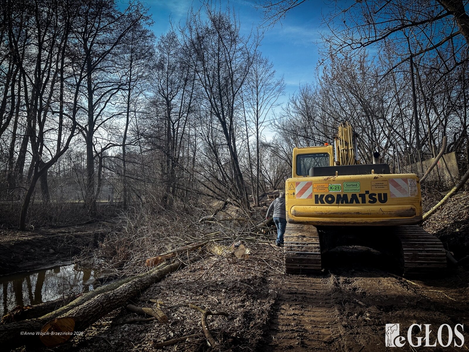 Plac budowy pokazuje prawdziwą skalę tej inwestycji. W fotorelacji widać wycięte drzewa, odsłonięty brzeg Skierniewki i teren, który musi zostać przygotowany pod mury oporowe oraz wzmocnienia skarp.