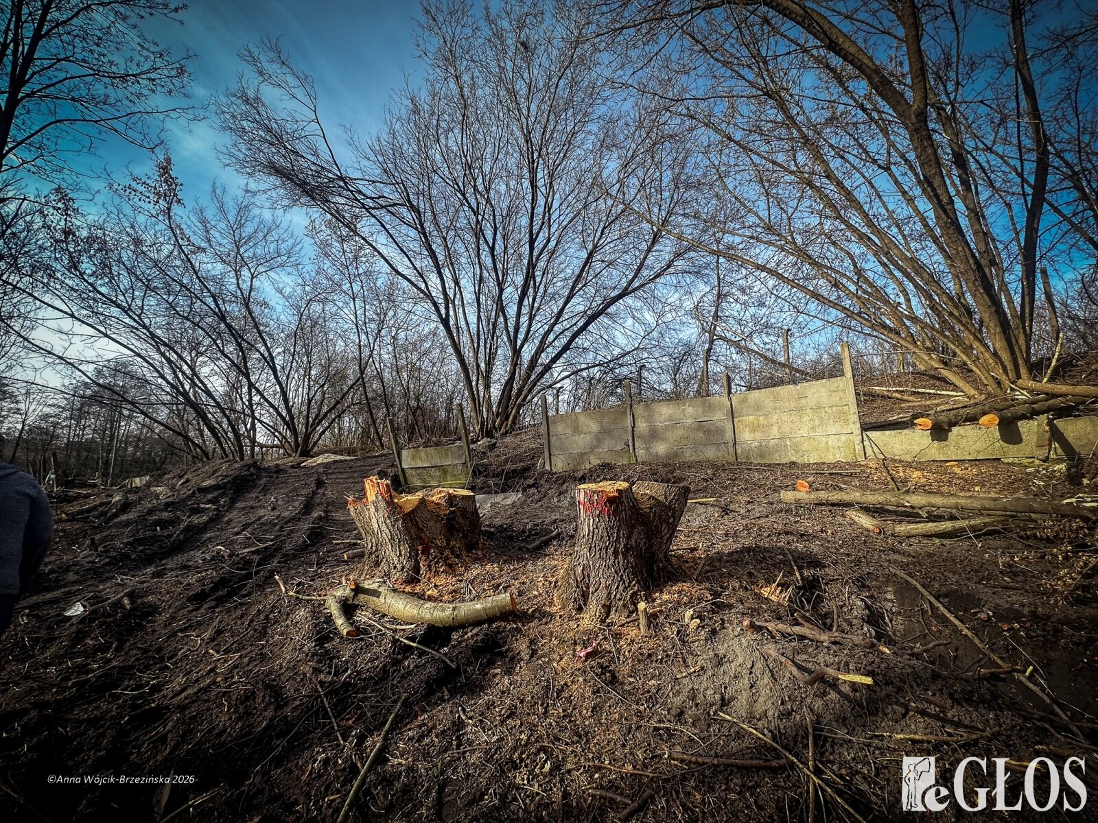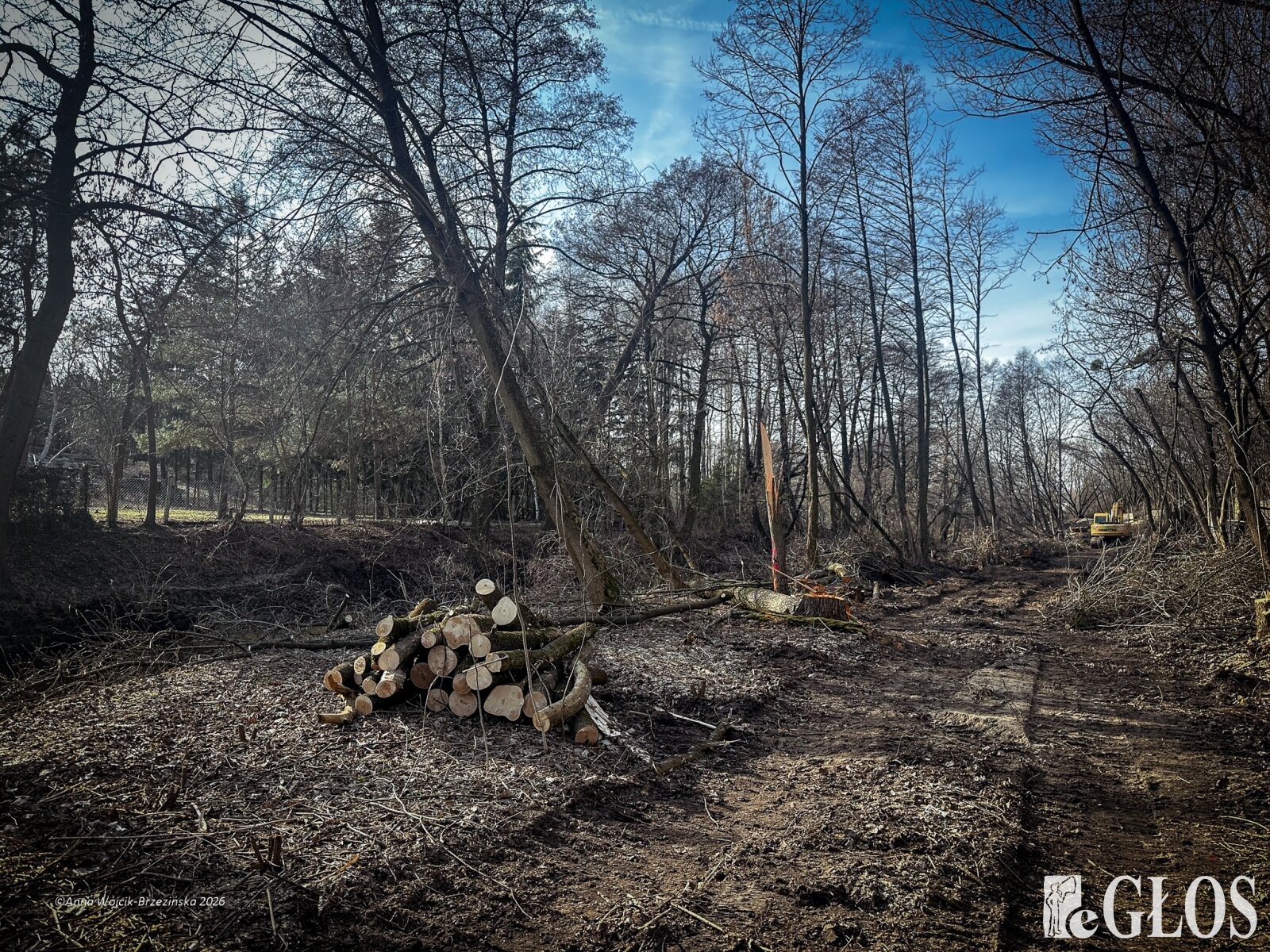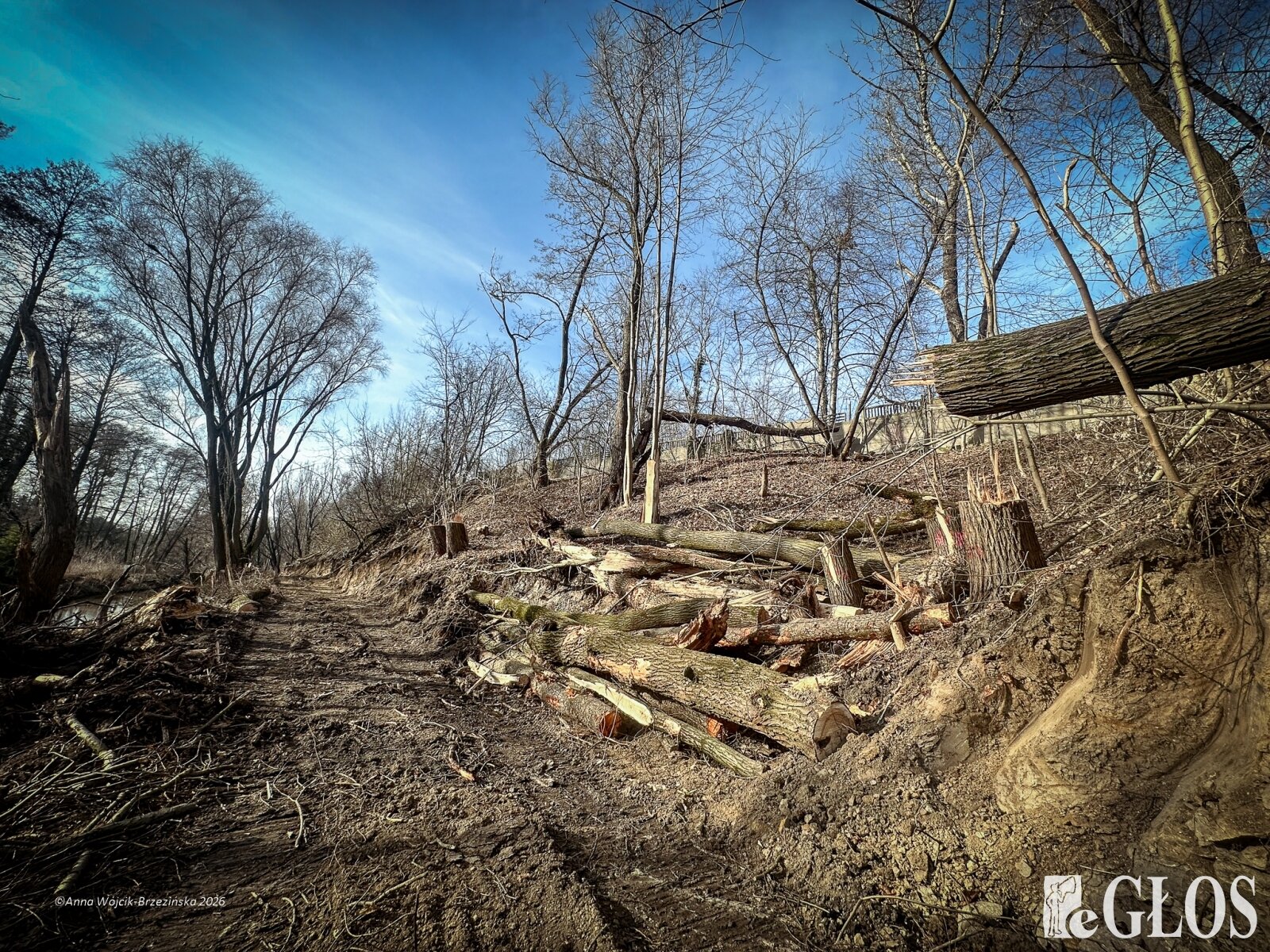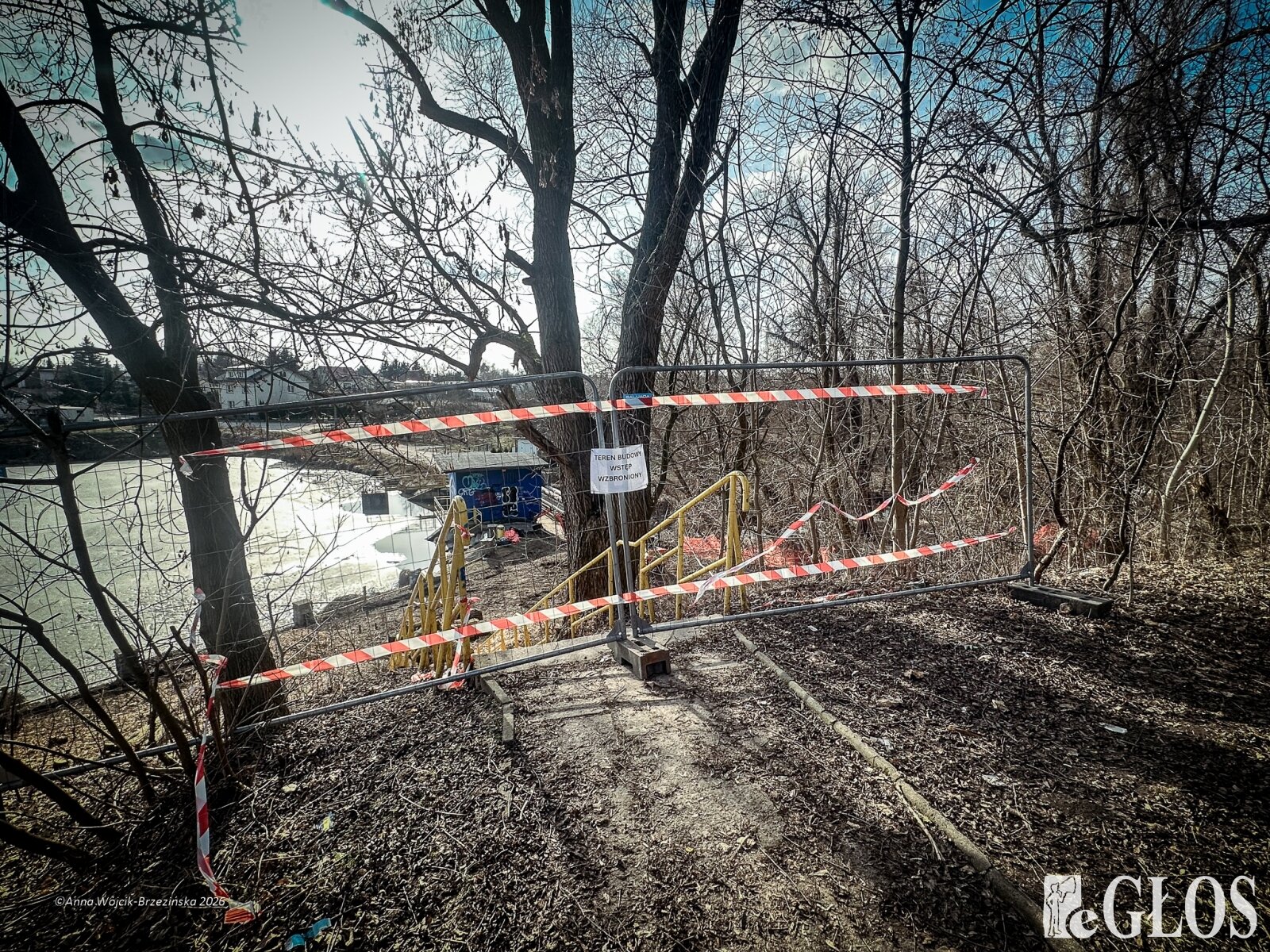 Plac budowy pokazuje prawdziwą skalę tej inwestycji. W fotorelacji widać wycięte drzewa, odsłonięty brzeg Skierniewki i teren, który musi zostać przygotowany pod mury oporowe oraz wzmocnienia skarp.