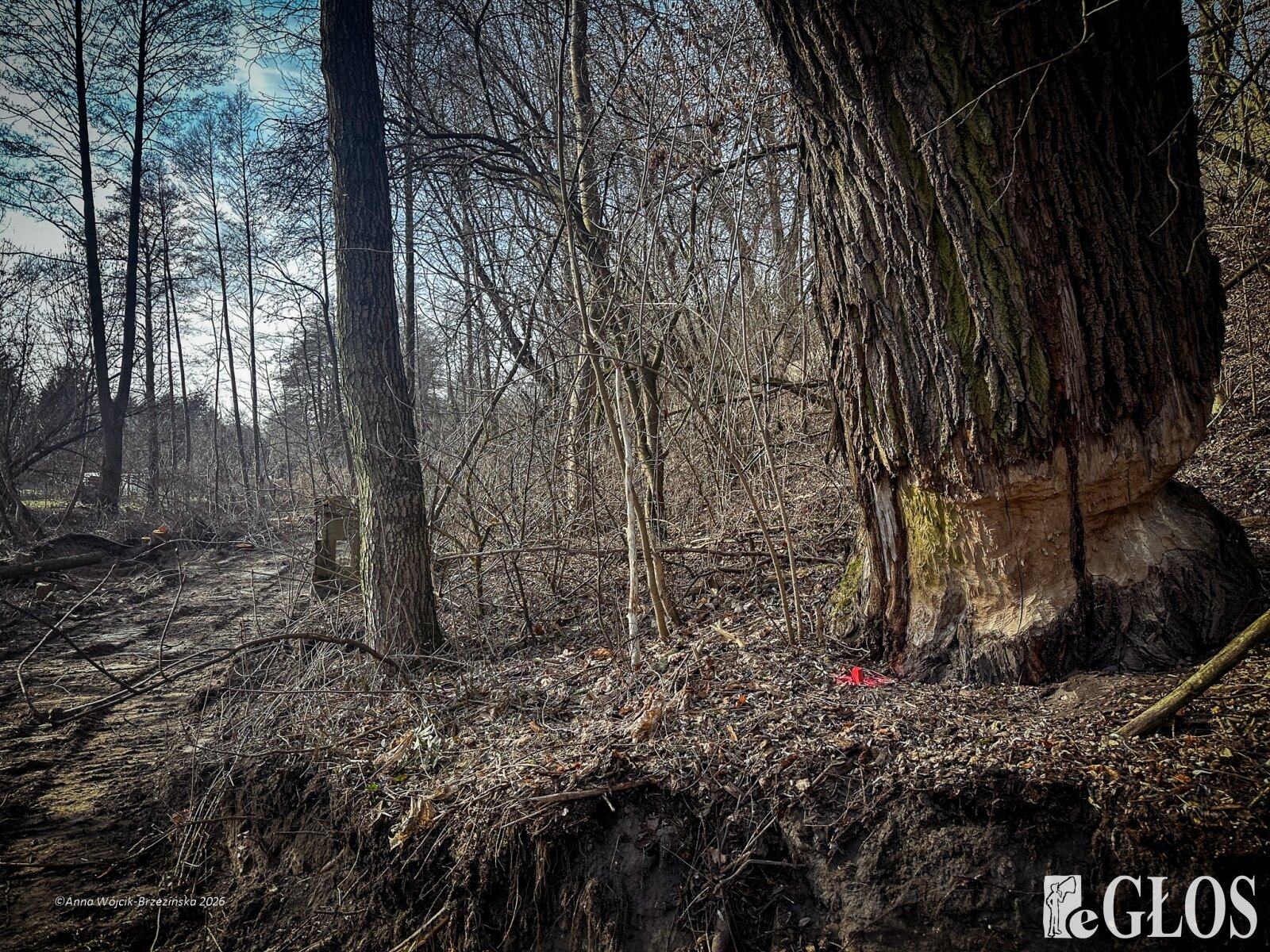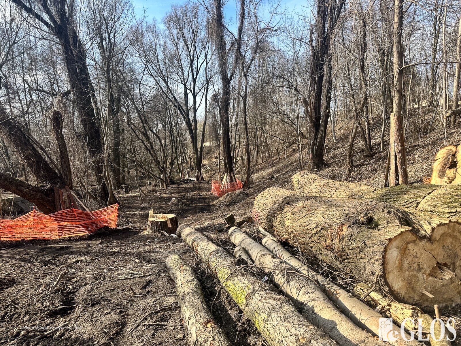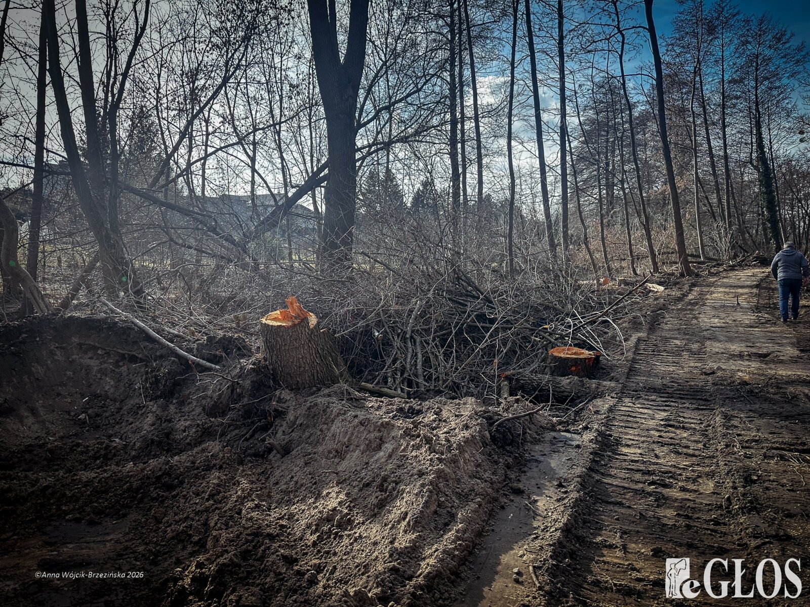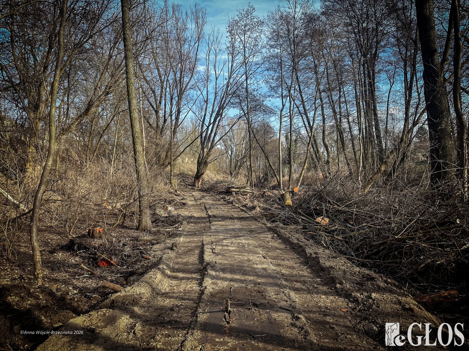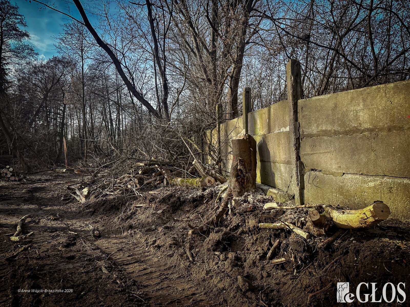 Plac budowy pokazuje prawdziwą skalę tej inwestycji. W fotorelacji widać wycięte drzewa, odsłonięty brzeg Skierniewki i teren, który musi zostać przygotowany pod mury oporowe oraz wzmocnienia skarp.