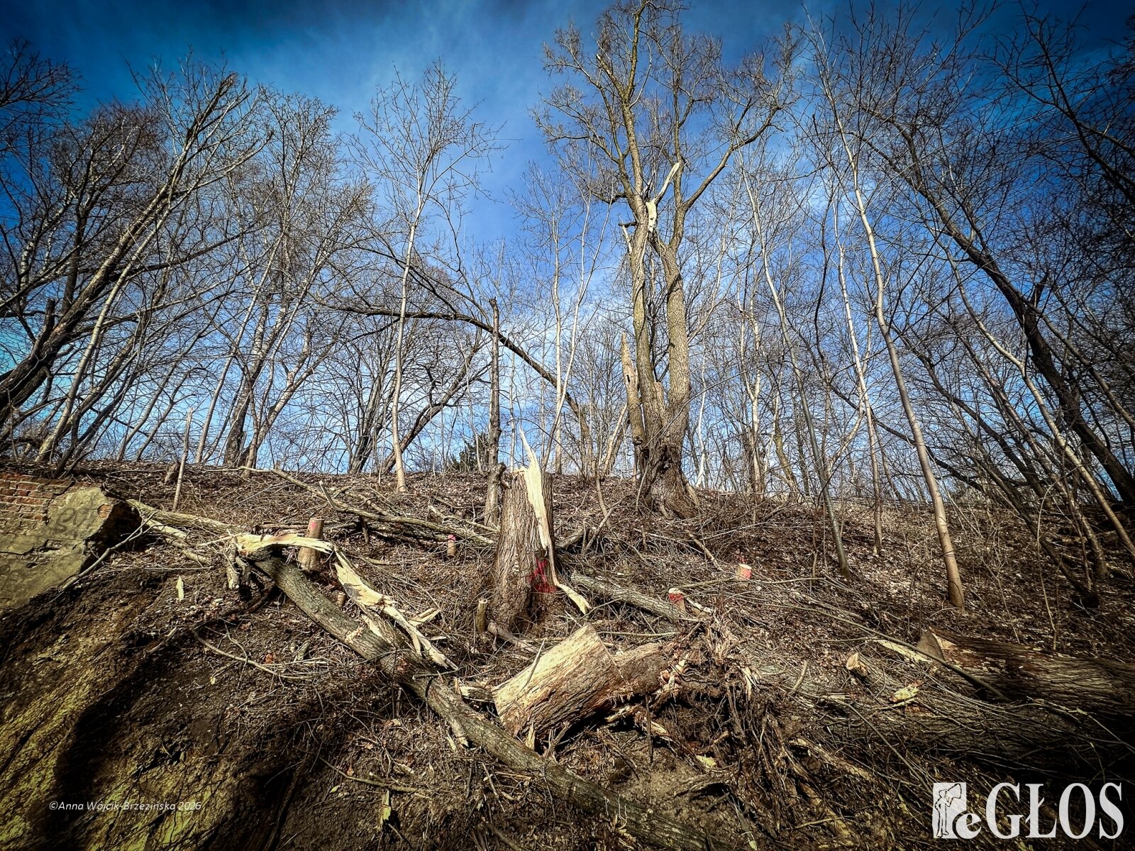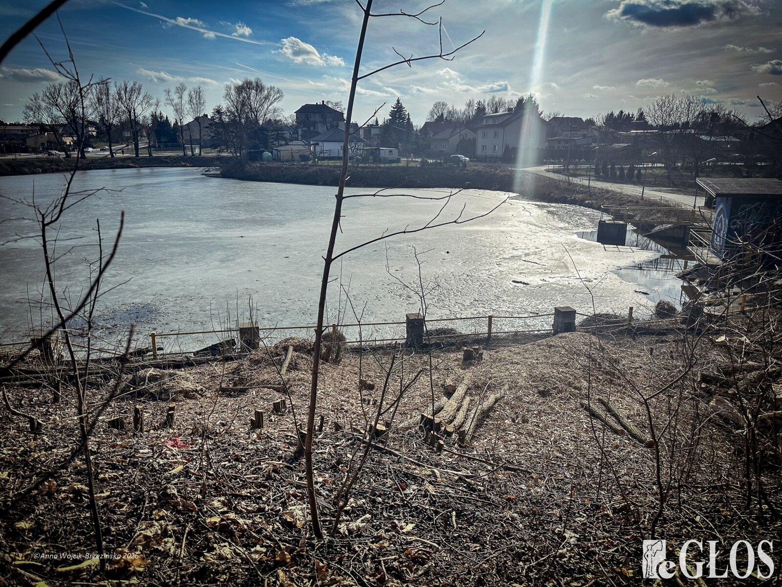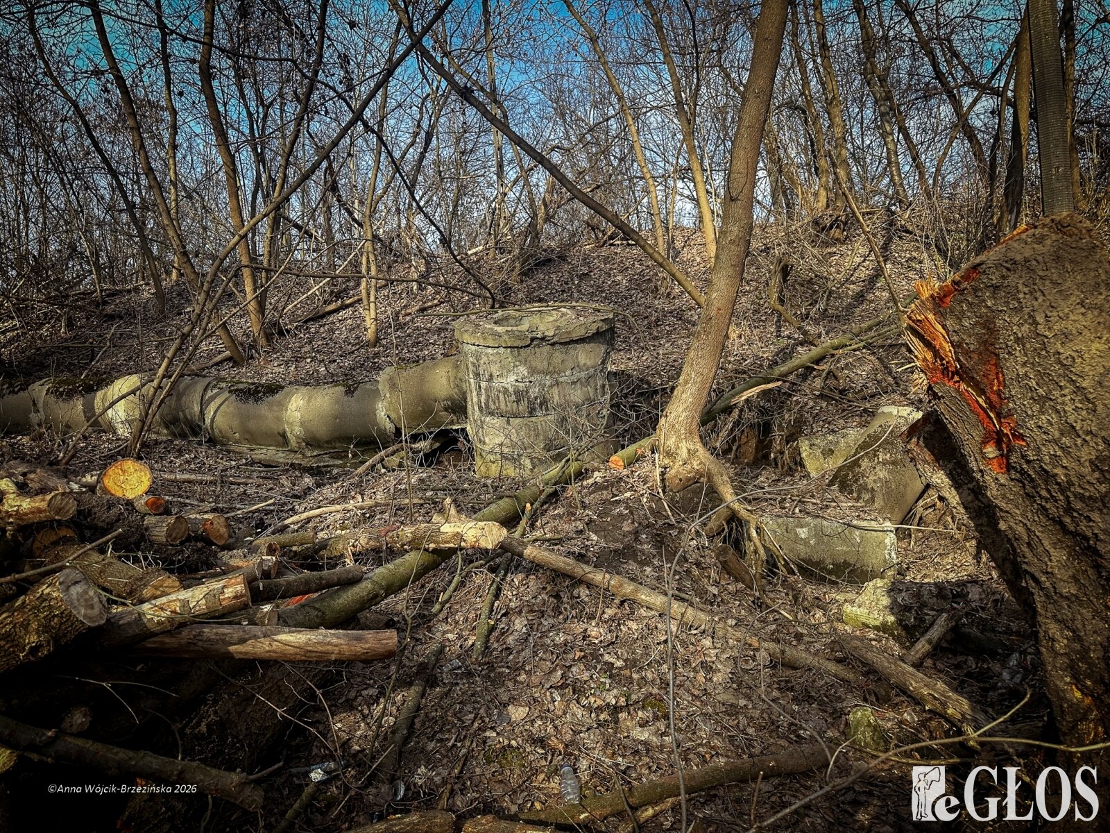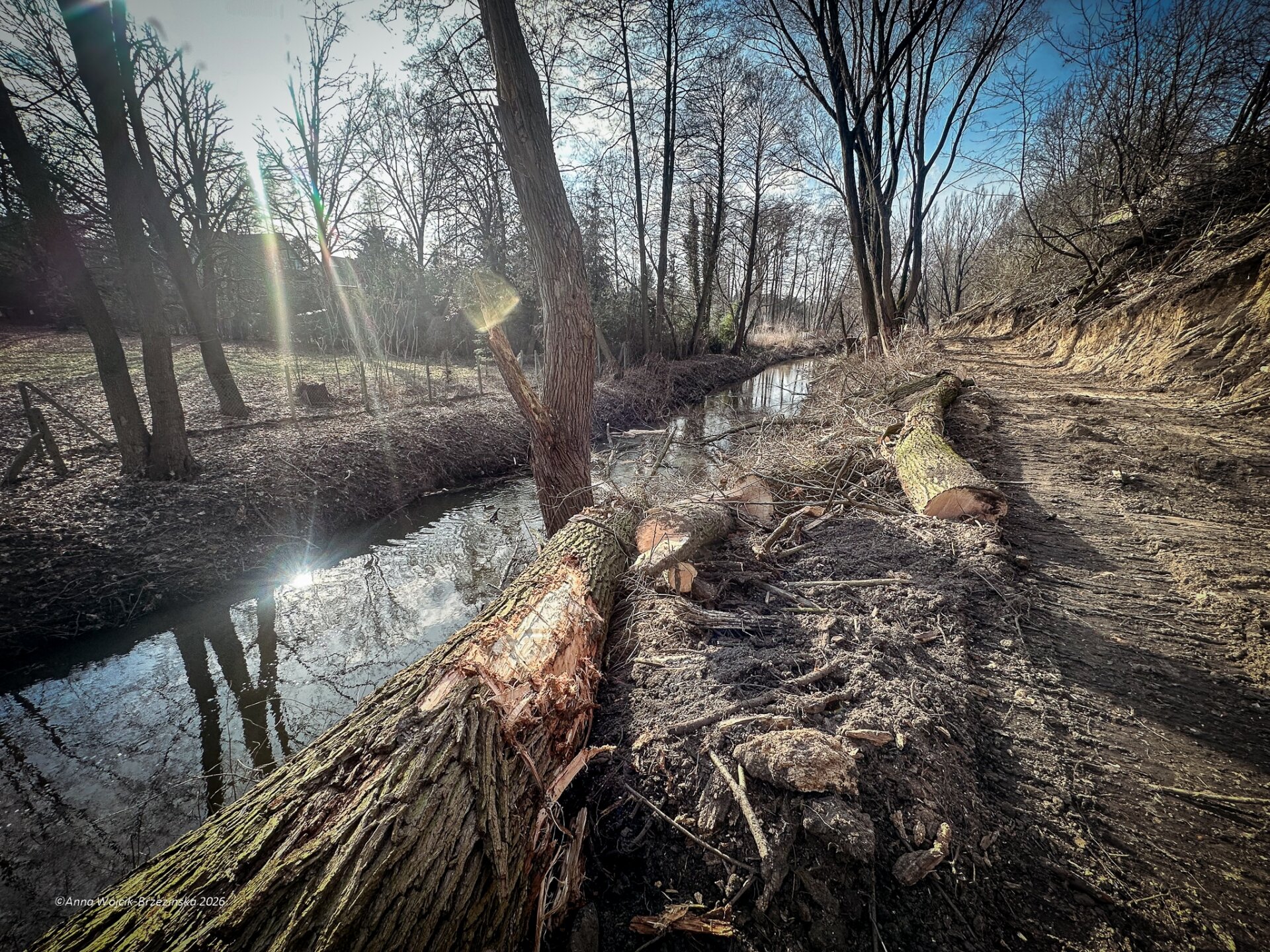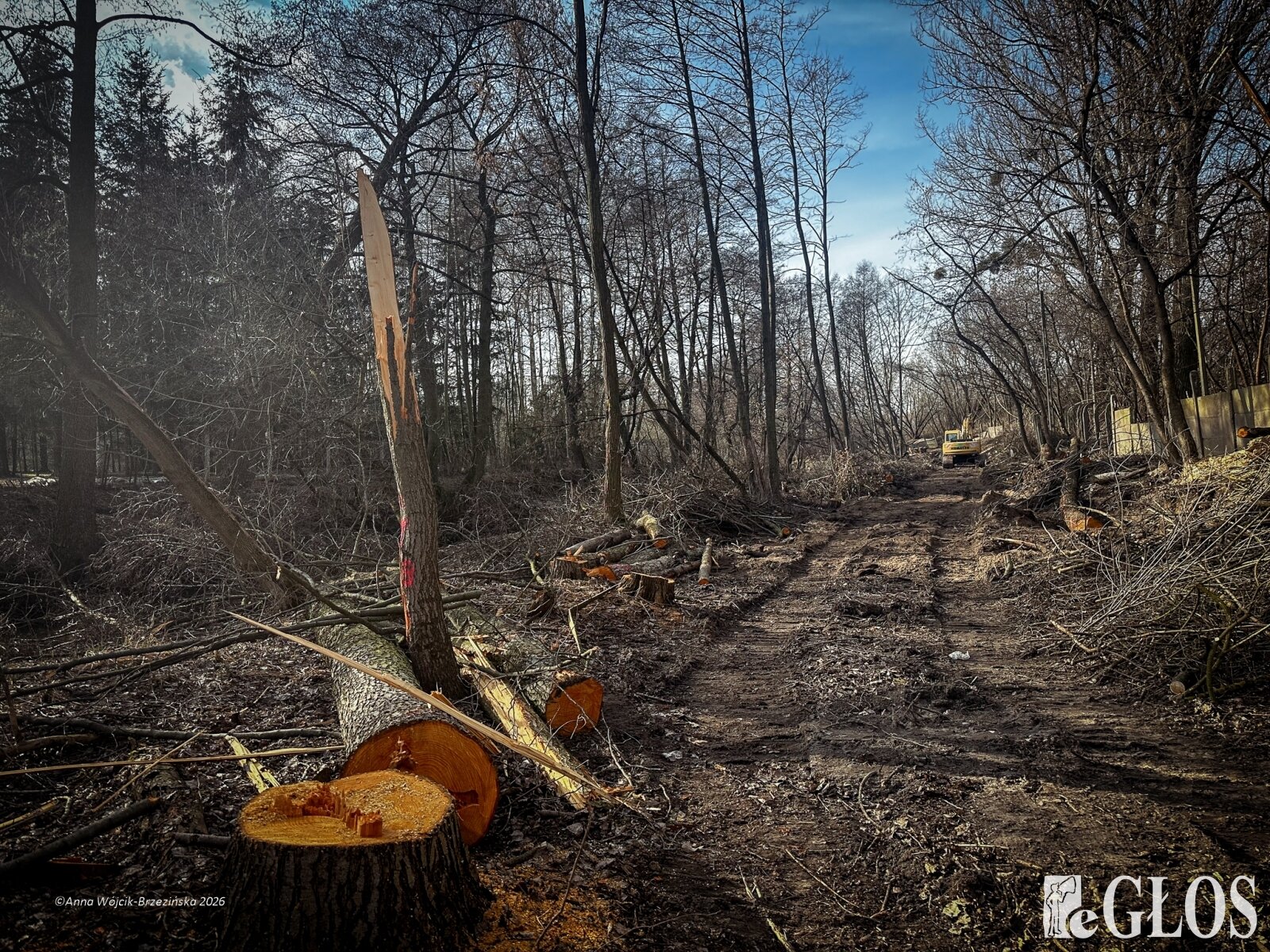 Plac budowy pokazuje prawdziwą skalę tej inwestycji. W fotorelacji widać wycięte drzewa, odsłonięty brzeg Skierniewki i teren, który musi zostać przygotowany pod mury oporowe oraz wzmocnienia skarp.