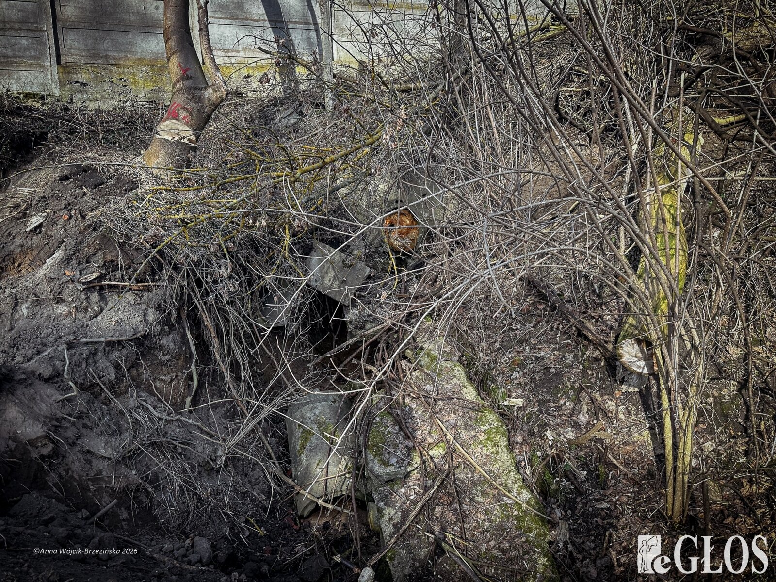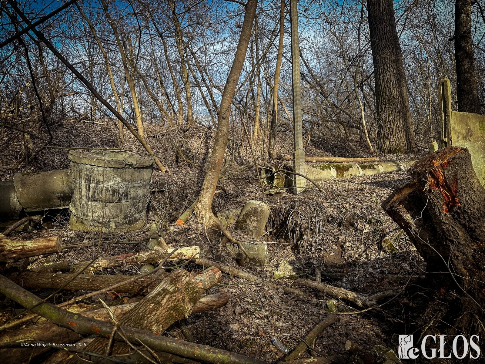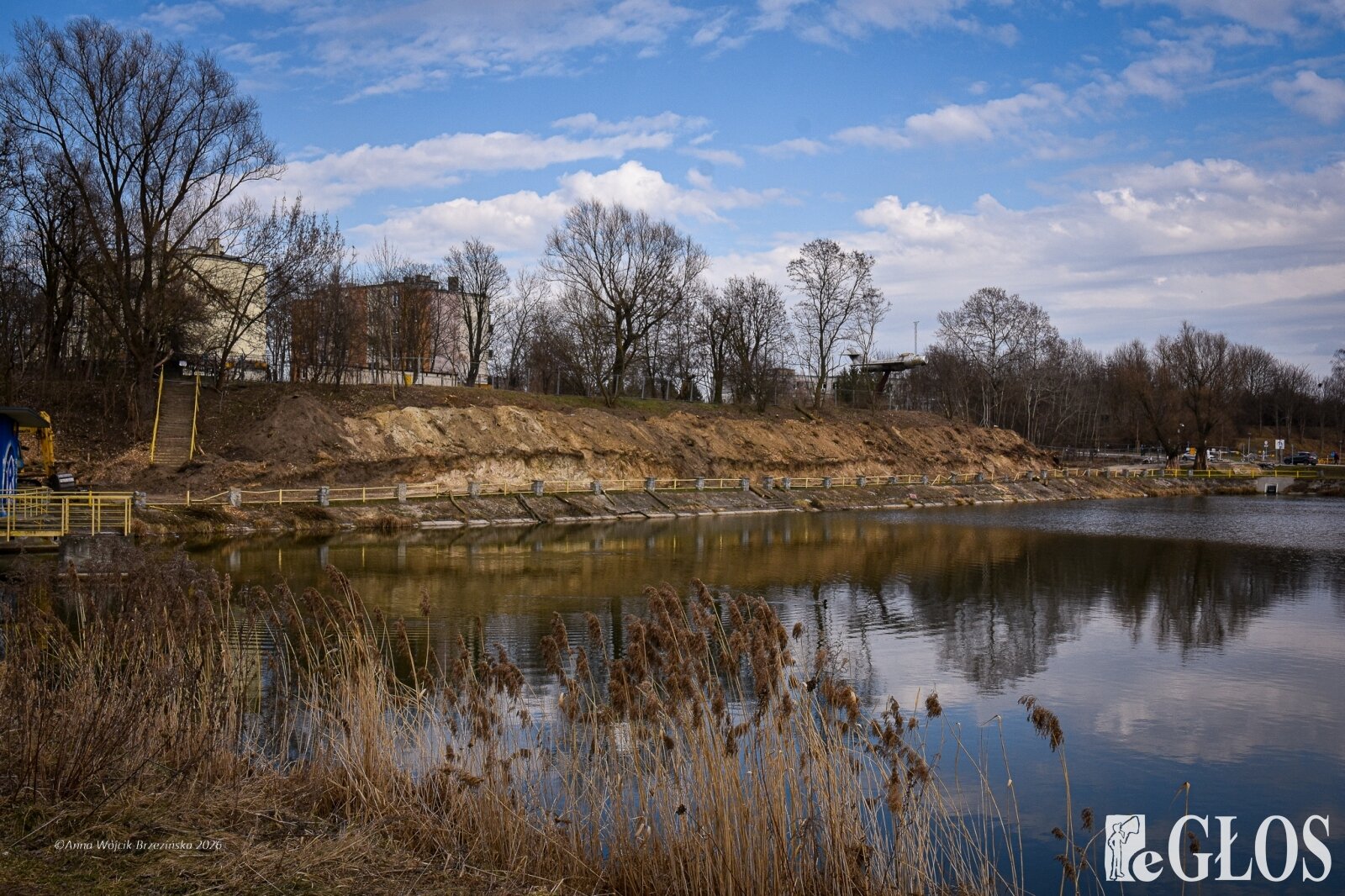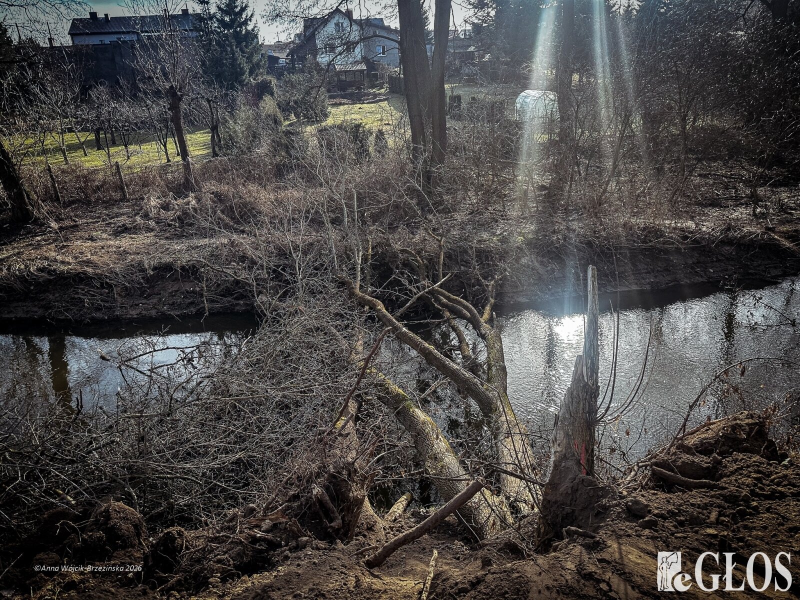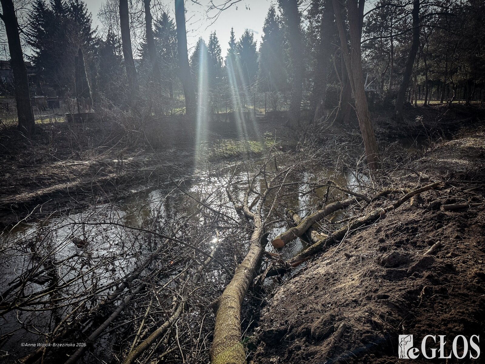 Plac budowy pokazuje prawdziwą skalę tej inwestycji. W fotorelacji widać wycięte drzewa, odsłonięty brzeg Skierniewki i teren, który musi zostać przygotowany pod mury oporowe oraz wzmocnienia skarp.