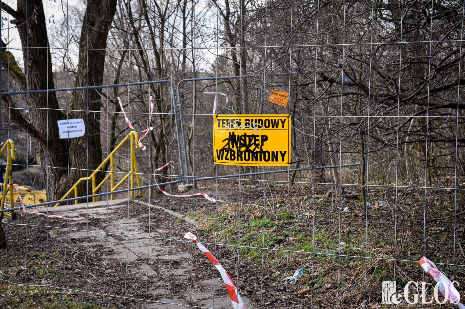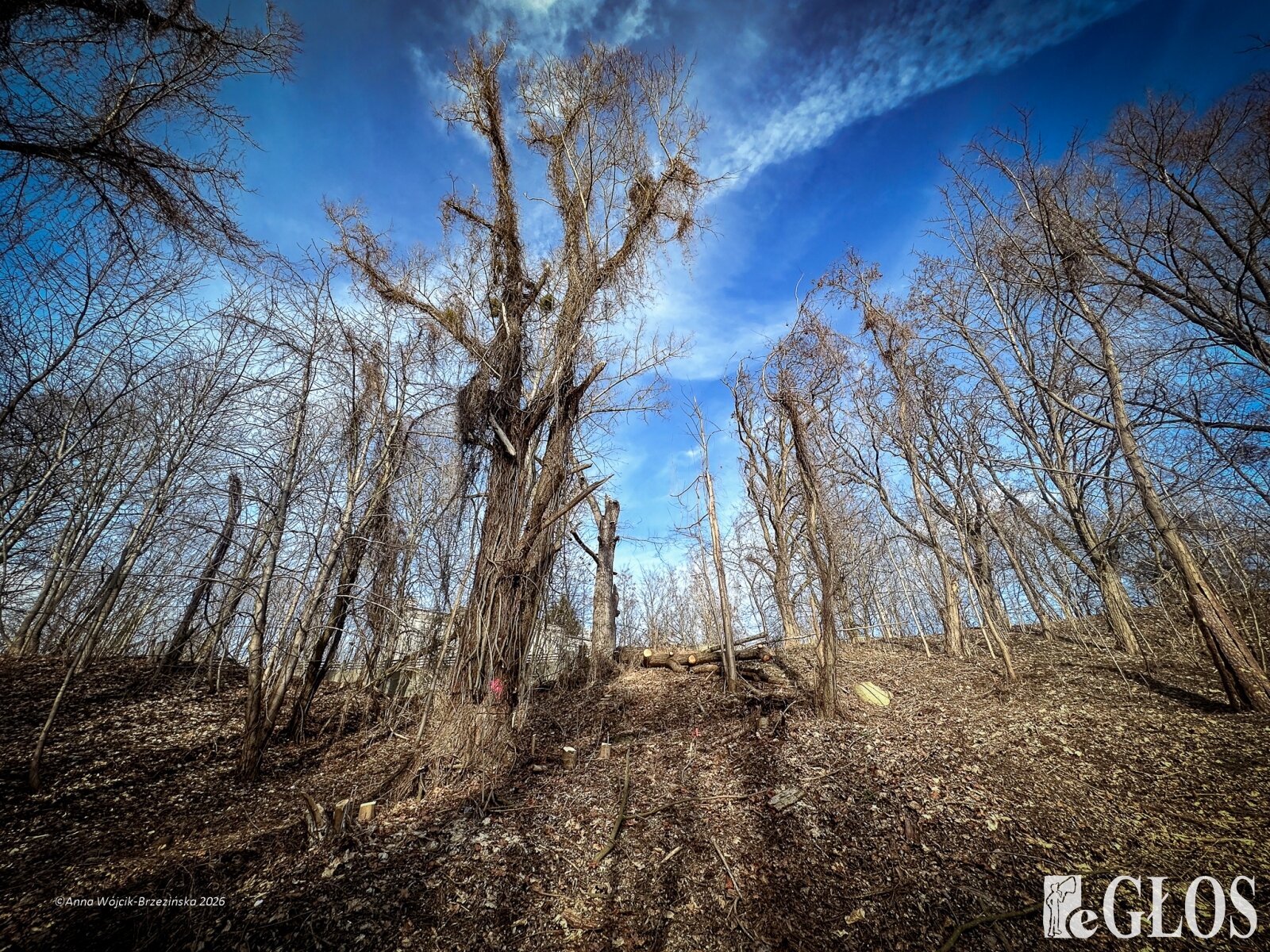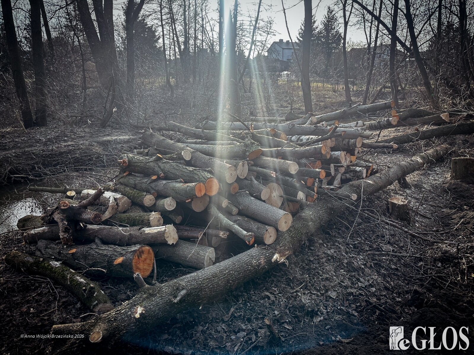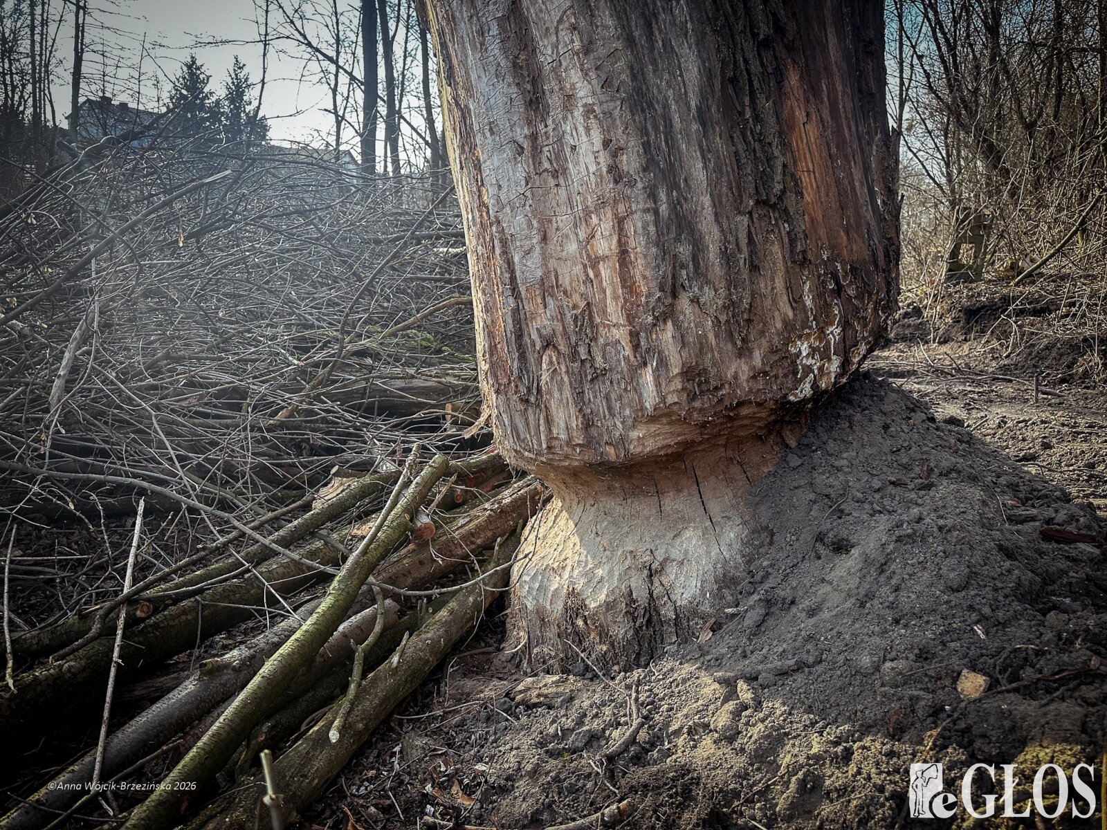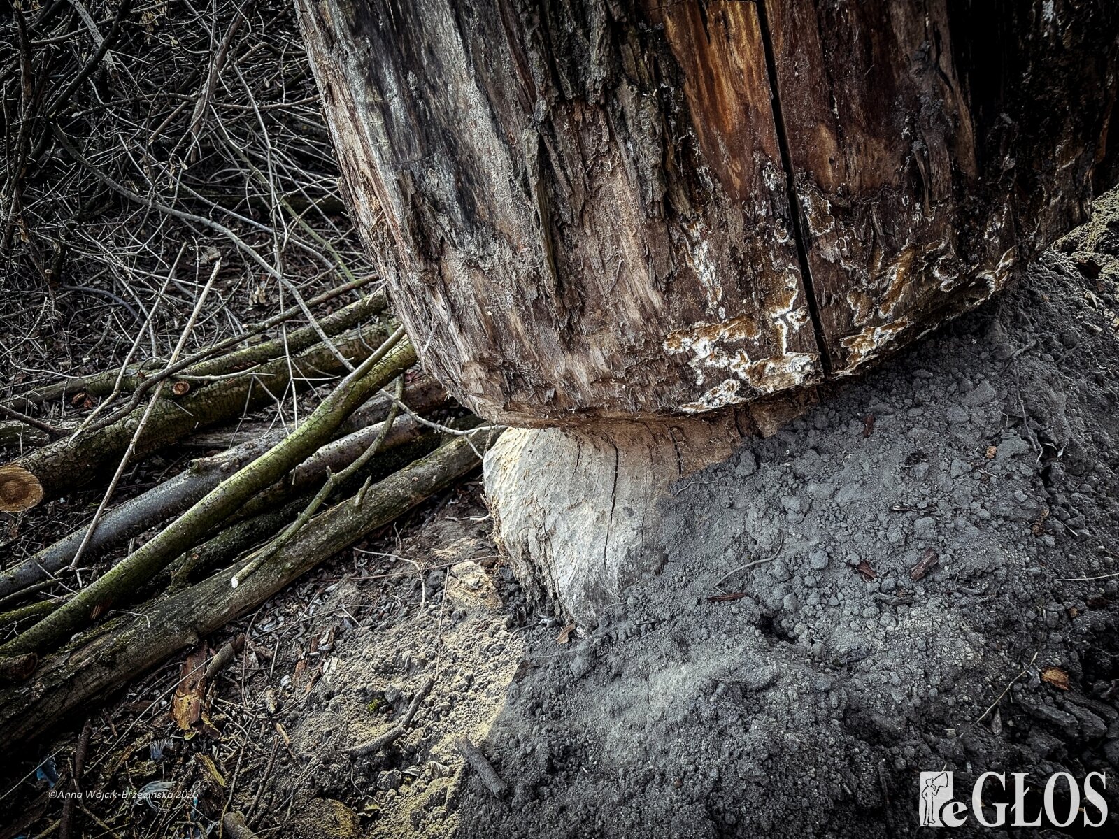 Plac budowy pokazuje prawdziwą skalę tej inwestycji. W fotorelacji widać wycięte drzewa, odsłonięty brzeg Skierniewki i teren, który musi zostać przygotowany pod mury oporowe oraz wzmocnienia skarp.
