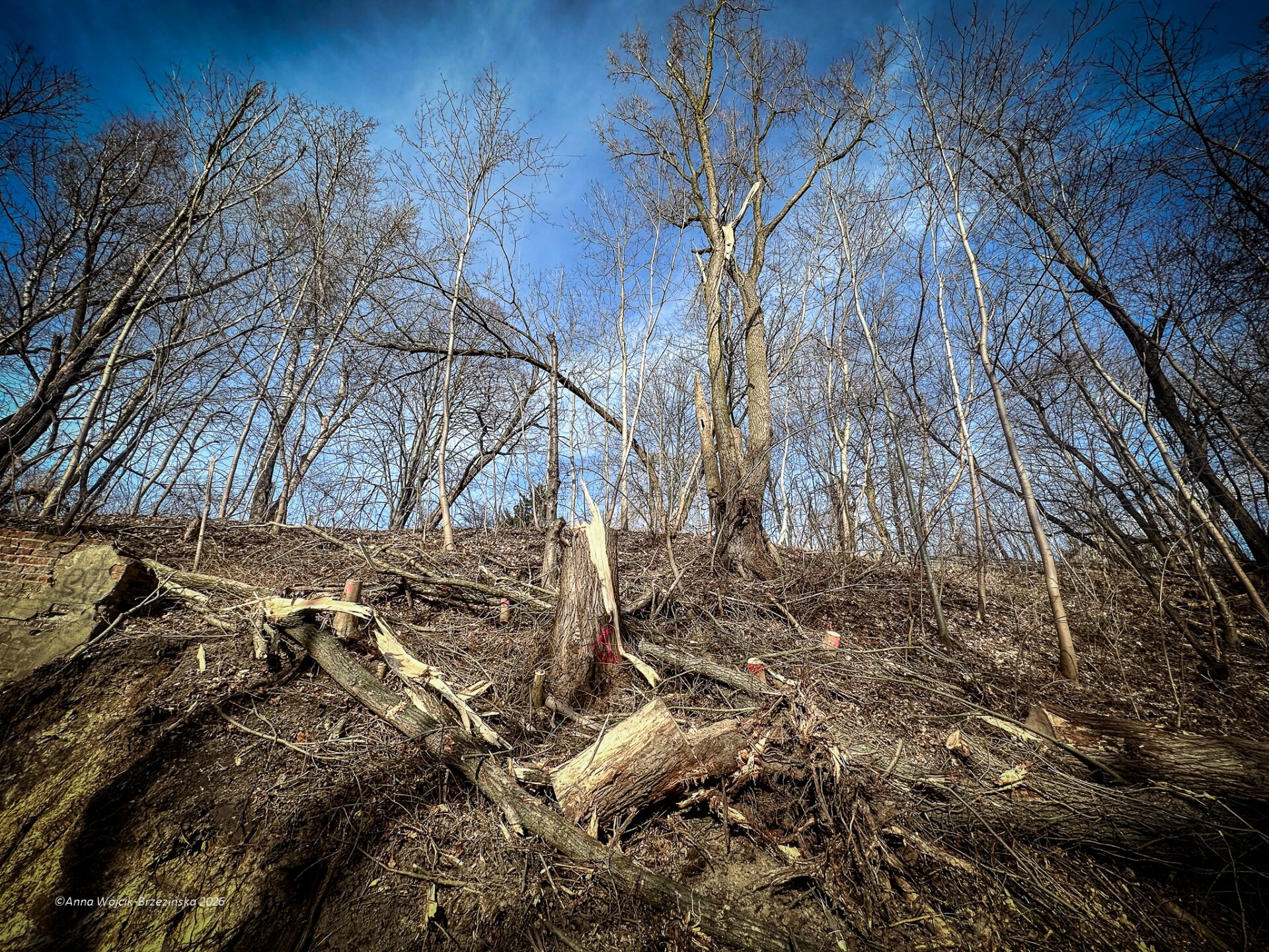 Plac budowy pokazuje prawdziwą skalę tej inwestycji. W fotorelacji widać wycięte drzewa, odsłonięty brzeg Skierniewki i teren, który musi zostać przygotowany pod mury oporowe oraz wzmocnienia skarp.